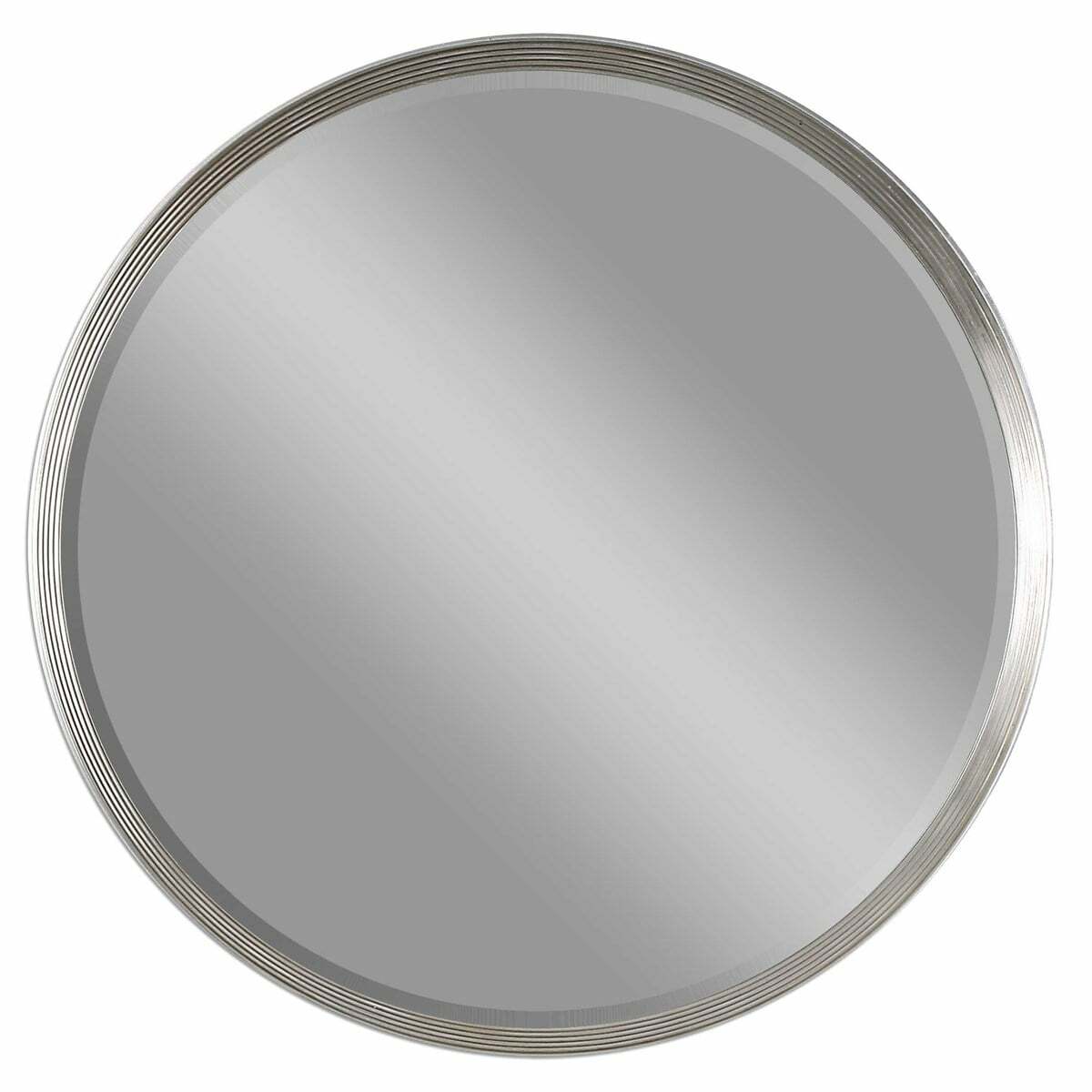 Frame features a stepped profile with silver leaf finish and black outer edge. Mirror has a generous 1 1/4″ bevel.Dimensions:42 W X 42 H X 3 D (in)Weight:47
