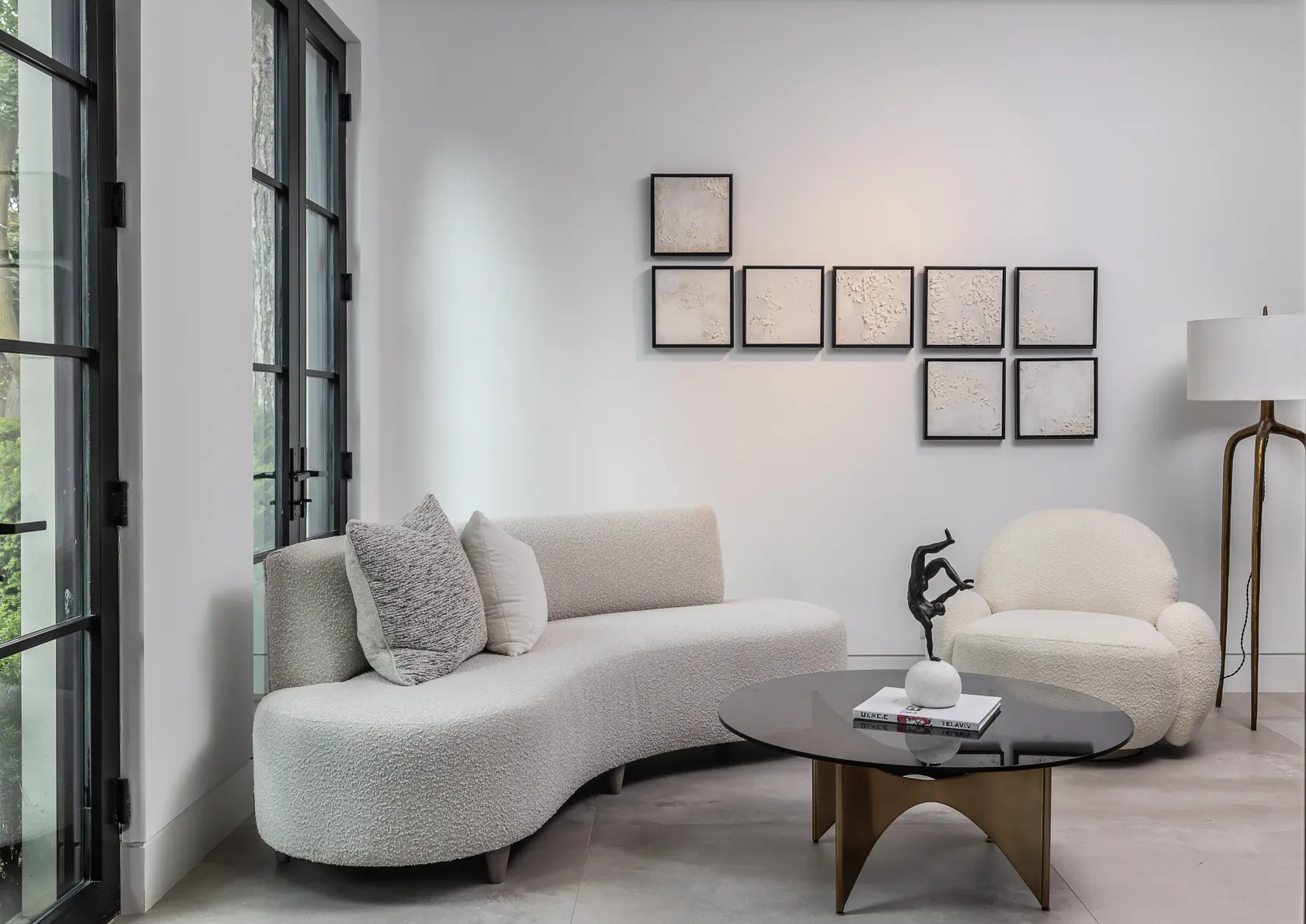 Mid-century silhouettes (a slatted walnut credenza and tapered-leg lounge chair) blend seamlessly with contemporary accents like a marble-top side table. A plush area rug and textured throw pillows introduce tactile contrast that enhances the room’s cohesive, lived-in feel.